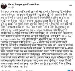 उनले फेसबुकमा लेखेका छन्, ‘प्रिय सुदन गुरुङज्यू, तपार्इं देशको गृह मन्त्री बन्नु भएकोमा मैले बधाइ दिएको छैन । मलाई ‘हर्क दाइ’ भन्नु हुन्छ । त्यो साइनोले ‘भाइ हो तपाइँ मेरो’ मलाई ‘हर्कजी’ भन्नु हुन्छ । त्यो अर्थमा ‘साथी हो तपाइँ मेरो ।’ तर यो देशको विधि र संविधानलाई मान्दा तपाइँ ‘माननीय गृहमन्त्रीज्यू’ हुनुहुन्छ ।’