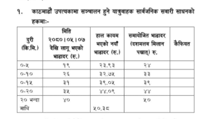 नयाँ भाडादर अनुसार काठमाडौँ उपत्यकाभित्र र बाहिरका रुटहरूमा फरक–फरक दर कायम गरिएको छ ।