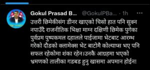 उत्तरी छिमेकीसँग डिनर खाएको चिसा हात सुक्न नपाउँदै प्रचण्ड राजनीतिक भिक्षा माग्न दक्षिणी छिमेकी भारत पुगेको आरोप उनले लगाएका छन् ।