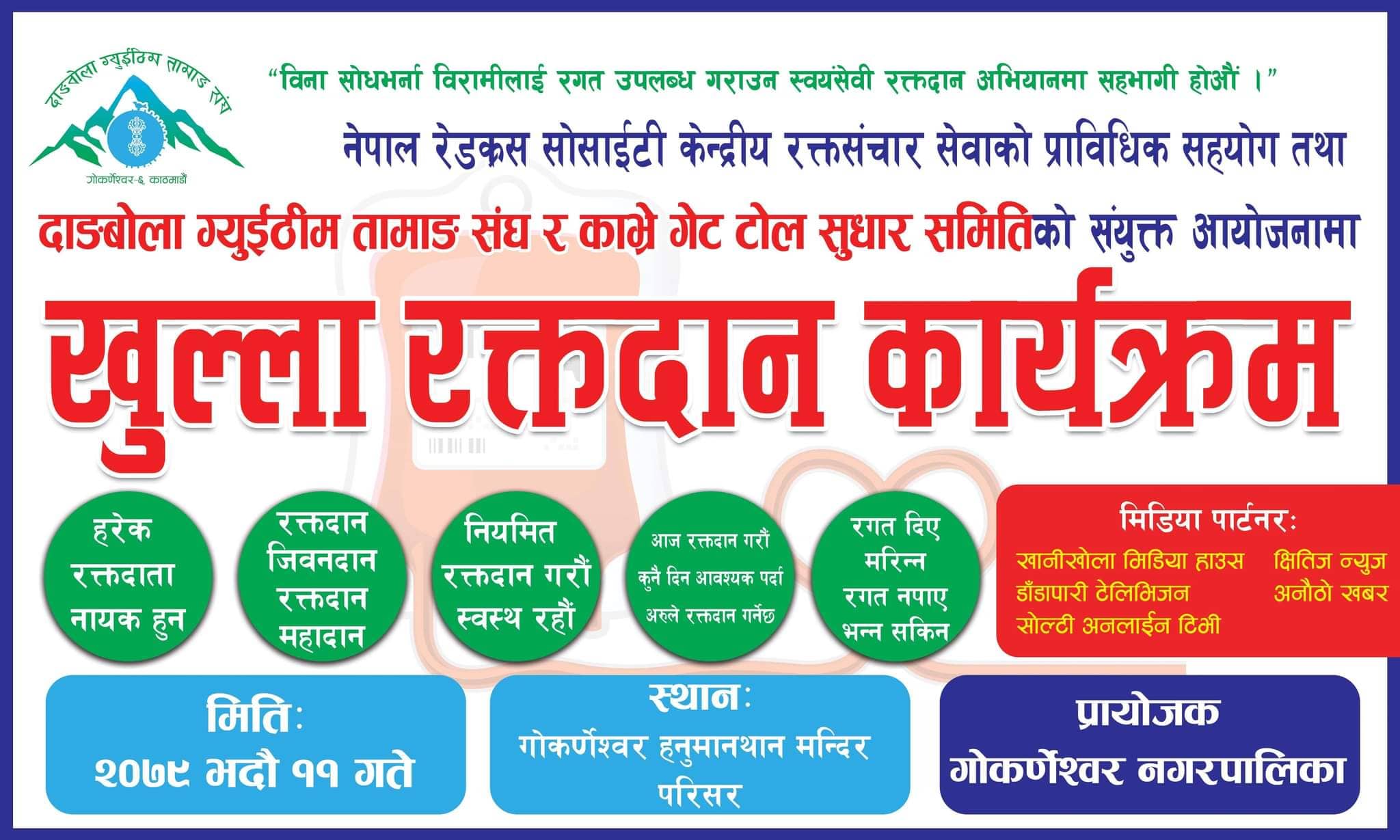 रक्तदान गोकर्णेश्वर नगरपालिकाकी उपमेयर सान्नानी लामाको प्रमुख आतिथ्यता तथा नेपाल रेडक्रस सोसाईटी केन्द्रीय रक्तसञ्चार सेवाको प्राविधिक सहयोगमा हुनेछ । दाङ्बोला ग्युइठिम तामाङ संघ र काभ्रे गेट टाल सुधार समितिको संयुक्त आयोजनामा हुने कार्यक्रममा विभिन्न संघ संस्थाले सहयोग गरेका छन् । कतिपय अस्पतालमा विरामीलाई रगत पाउनबाट समस्या हुदै आएकाले त्यसैलाई लक्षित गरि रक्तदान कार्यक्रमको आयोजना गरिएको आयोजकले जनाएको छ ।