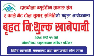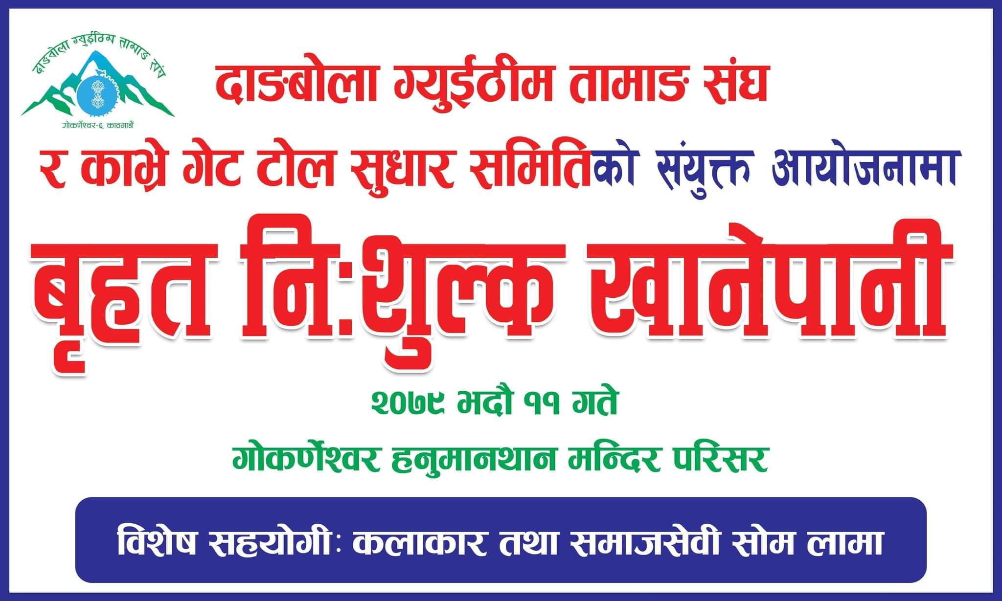 यसैगरी, दाङ्बोला ग्युइठिम तामाङ संघ र काभ्रे गेट टाल सुधार समितिको आयोजनामा नि ः शुल्क खानेपनि वितरण पनि गर्ने तयारी गरेको छ । त्यसका लागि कलाकार तथा समाजसेवी सोम लामाले सहयोग गरेका छन् ।