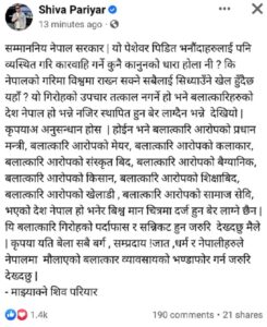 परियारले नेपाल सरकारलाई सम्बोधन गर्दै भनेका छन् : ‘सम्माननीय नेपाल सरकार, यो पेसेवर पीडित भनौंदाहरुलाई पनि व्यवस्थित गरी कारवाही गर्ने कुनै कानुनको धारा होला नि ? कि नेपालको गरिमा विश्वमा राख्न सक्ने सबैलाई सिध्याउने खेल हुँदैछ यहाँ ? यो गिरोहको उपचार तत्काल नगर्ने हो भने बलात्कारीहरूको देश नेपाल हो भन्ने नजिर स्थापित हुन बेर लाग्दैन भन्ने देखियो । कृपया अनुसन्धान होस् ।’
