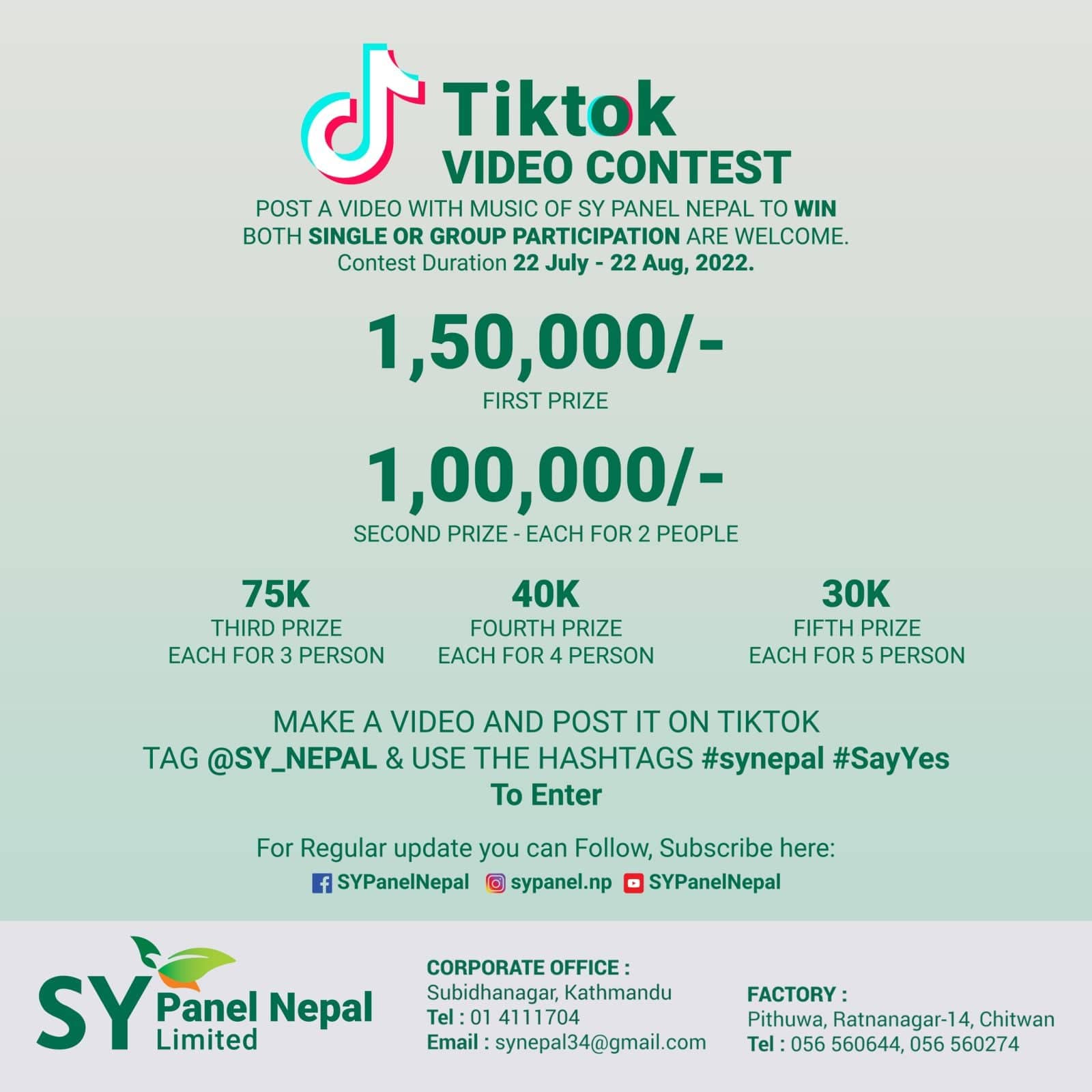 एसवाई प्यानल नेपाल टिकटक प्रतियोगिता गर्दै, प्रथमलाई १ लाख ५० हजार दिने